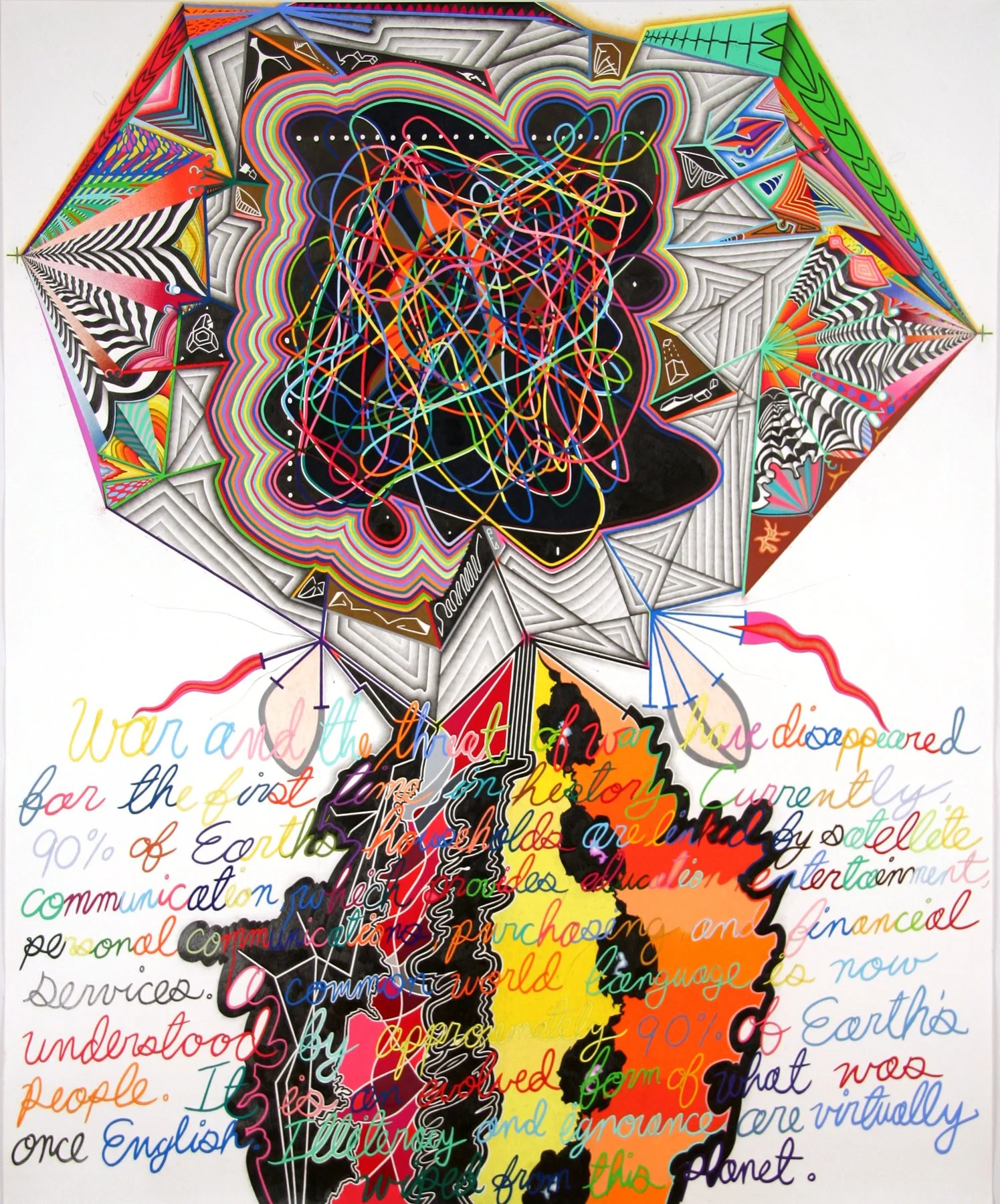 This process acts as a reverse translation. Just as the original premonition must have been sensed intuitively before it was constrained by words, this work attempts to return that linguistic structure to a purely visual, preverbal state. The prediction itself, now proven false, remains significant. The failure of such prophecies reveals less about the actual future and more about the human necessity to create it. Our compulsion to predict specific utopian outcomes, like a unified language or a unified continent, speaks to a deep, collective desire to impose order and hope onto an unknowable timeline.